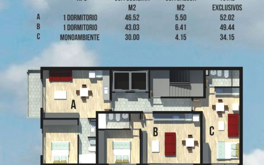 1 Dormitorio: Living-comedor con cocina integrada, 1 dormitorio, ante baño y baño completo. Balcón. Sup. 47 m2