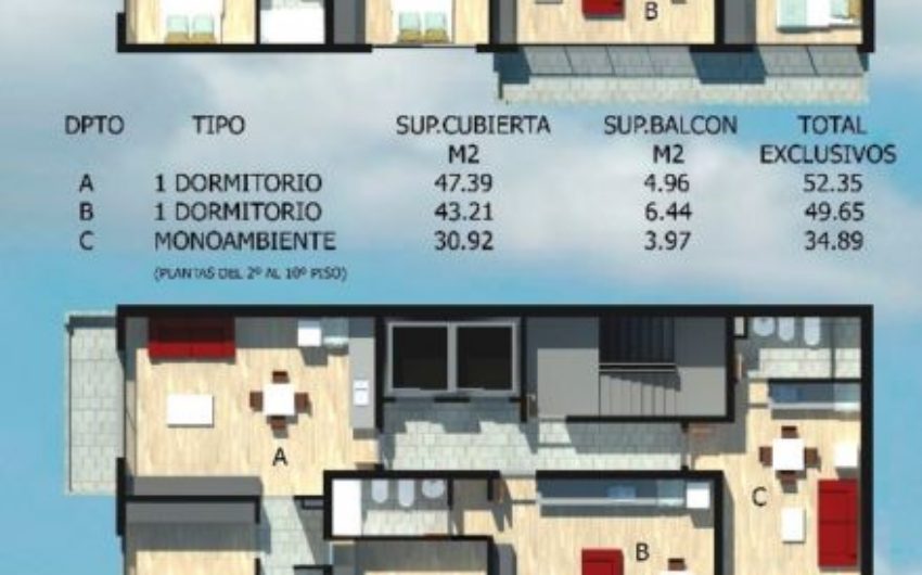 2 Dormitorios: Living-comedor con cocina integrada, 2 dormitorios, un baño completo. Balcón. Sup 60 m2.