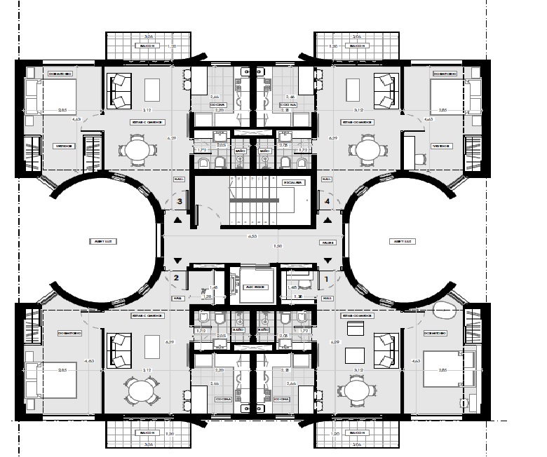 Es un edificio compuesto por 7 pisos, más azotea y planta baja. Son cuatro departamentos de un dormitorio por planta, dos al frente y dos al contra frente. Posibilidad de uso Comercial (oficina).